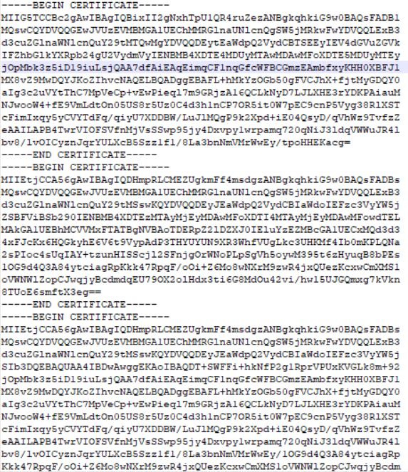 分别用文本编辑器打开三个文件,将文件2和文件3中内容依次复制粘贴到文件1的内容之后保存即可。(根证书在合并时可以不放,也可以放在除了第一顺序的任何其他顺序,中间不能出现空格或其他任意符号)