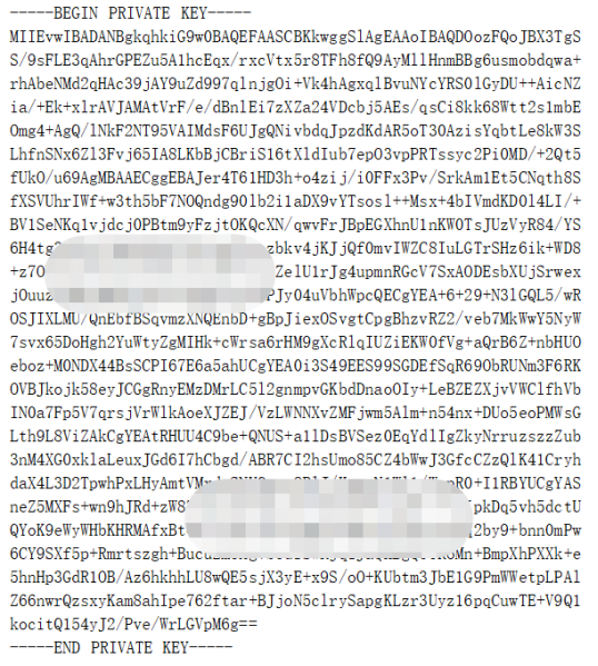 3、Key文件(私钥),在提交CSR申请证书时,提示保存的Key文件下载到本地(如他人代为提交申请,请联系代办人员提供Key文件。)其格式如下: