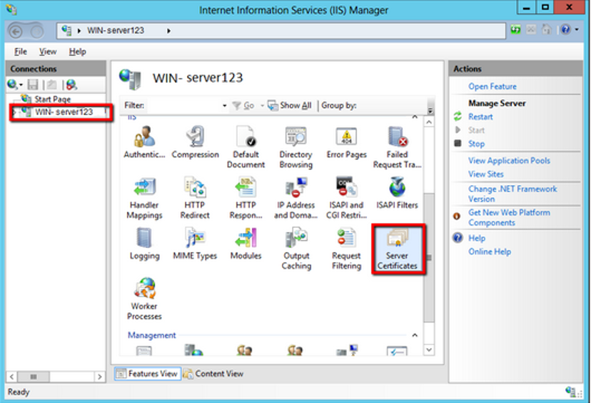 2.在【Internet信息服务(IIS)管理器】主窗口的【链接】菜单中,选择将要安装证书的服务器名称。